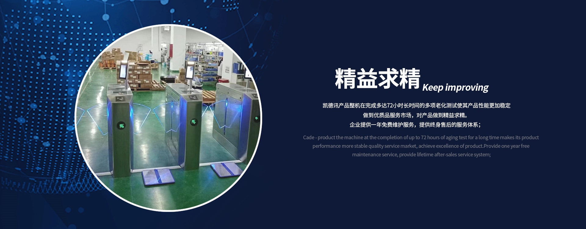 深圳市凱德訊科技有限公司成立于2003年,注冊資本500萬元,位于港珠澳大灣區的深圳市,公司集研發(fā)、生產、銷售電子行業防靜電門禁系統和民用智能通道系統的綜合性企業。公司擁有自主產權的產品并一直致力于ESD門禁系統、智能安防門禁系統、景區通道閘機、人臉識別閘機、消費系統、智能翼閘的研發(fā)生產與銷售。凱德訊目前擁有多款功能齊全的系統軟件及多款硬件產品,包含成型加工、機芯研發(fā)、軟件開發(fā)等技術均為本公司自主研發(fā)、獨立完成。14年來,凱德訊一直秉承以用戶需求為核心,穩(wěn)定、實用、智能的產品是我們開拓市場的基石,務實進取的精神是我們孜孜不倦的追求,全方位真誠的服務是我們對您永恒的承諾。